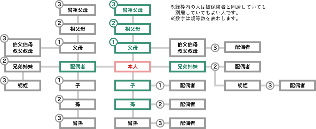 配偶者(内縁関係も可)、子・孫、兄・姉、弟・妹、父母・祖父母などの被保険者の直系尊属